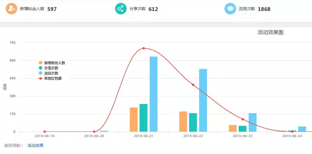 從以上活動效果截圖可看出,在紅包墻活動期間,就帶動商家廣告1868次閱讀,朋友圈分享人數達到612次,服務商新增粉絲597人。