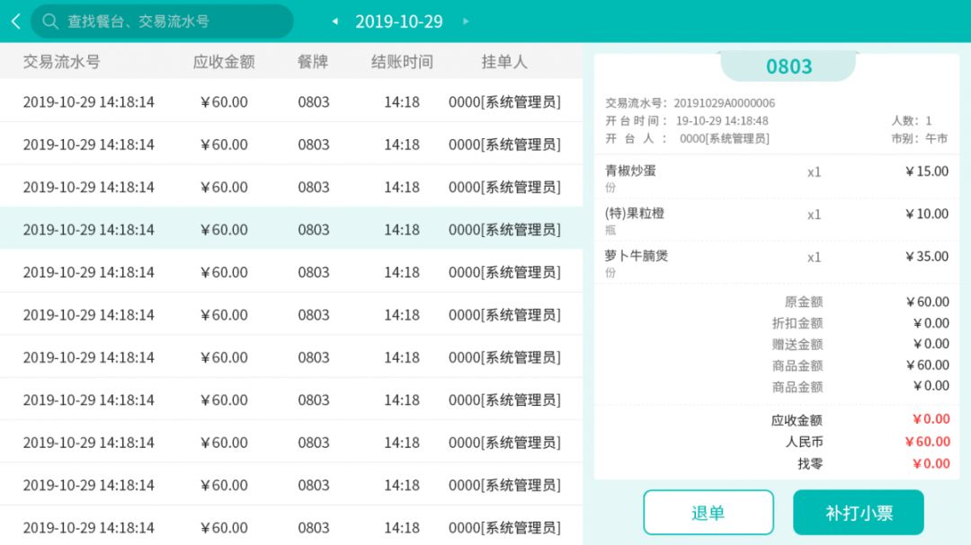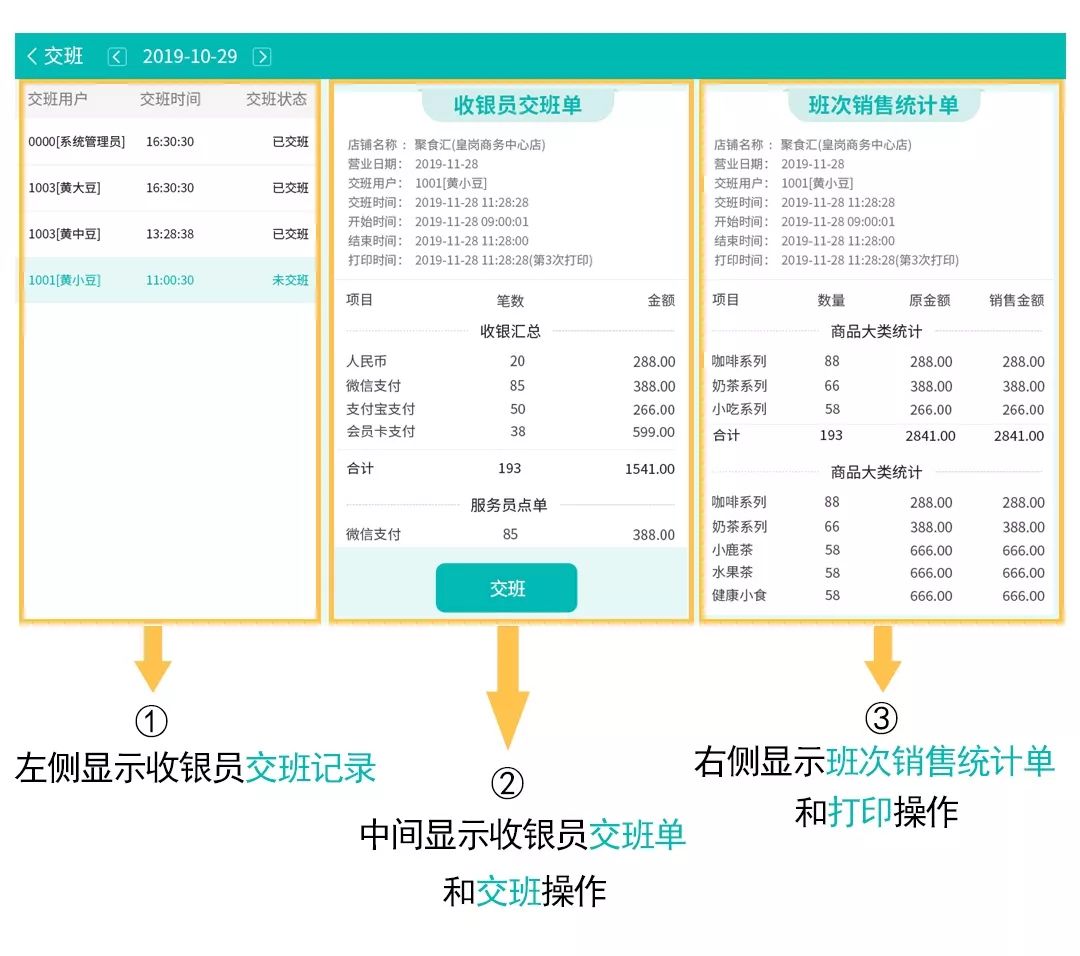 將界面分為三個板塊,交班記錄、交班單、班次銷售統計單,在點擊交班前,服務員就能清晰看到交班時的收銀記錄。