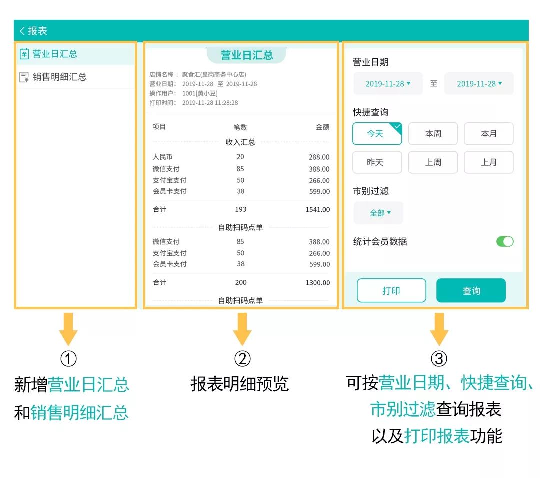 在報表功能,增加營業日匯總和銷售明細匯總,可通過不同分類查詢,讓每一項消費記錄都有跡可循。