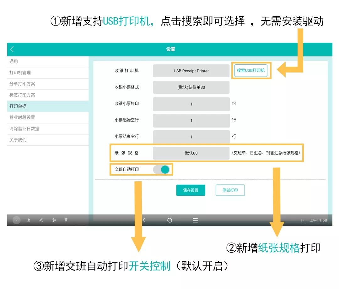 增加打印單據,支持USB打印機,可根據交班單、日匯總、銷售明細匯總選擇不同的紙張規格打印,并增加交班自動打印開關控制。