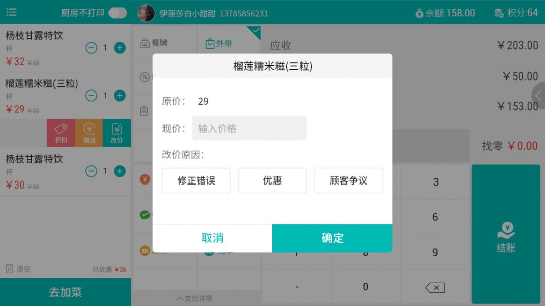 支持菜品折扣、菜品贈送、滿減活動等;集成多種主流支付方式,如現金、票券、會員卡、微信、支付寶等。