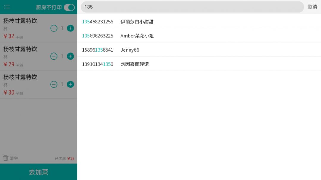 服務員觸屏操作,根據客人需求快速點單,可根據店內菜品進行分類設置,節約服務員查找菜品時間,點單更快速。
