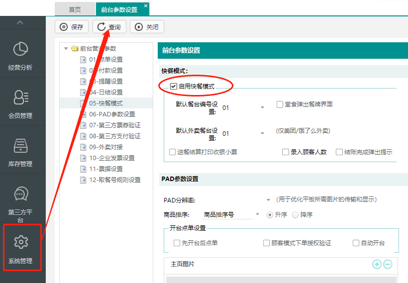系統管理中→選擇前臺參數設置→勾選“啟用快餐模式”。