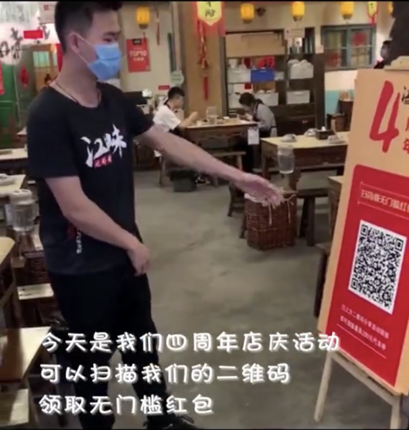 在進店處擺放海報展架,服務員會向顧客介紹“今天是我們四周年店慶活動,可以掃描我們的二維碼,領取無門檻紅包”帶動顧客積極性,引導掃碼。