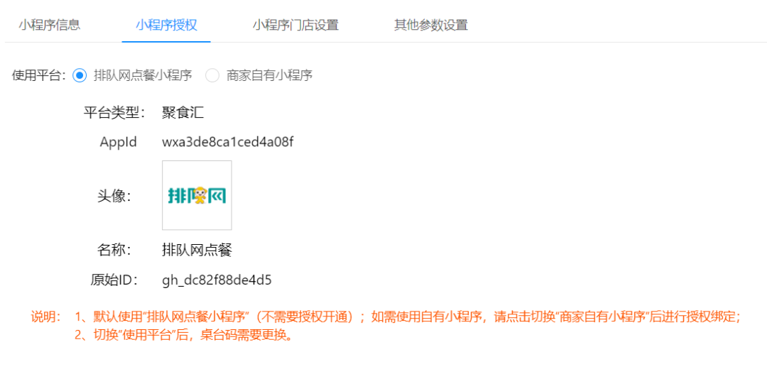 1、后臺-小程序,新增“排隊網點餐小程序”的使用平臺方式(即商家可直接使用排隊網小程序進行點餐,不需要開通授權自有小程序)