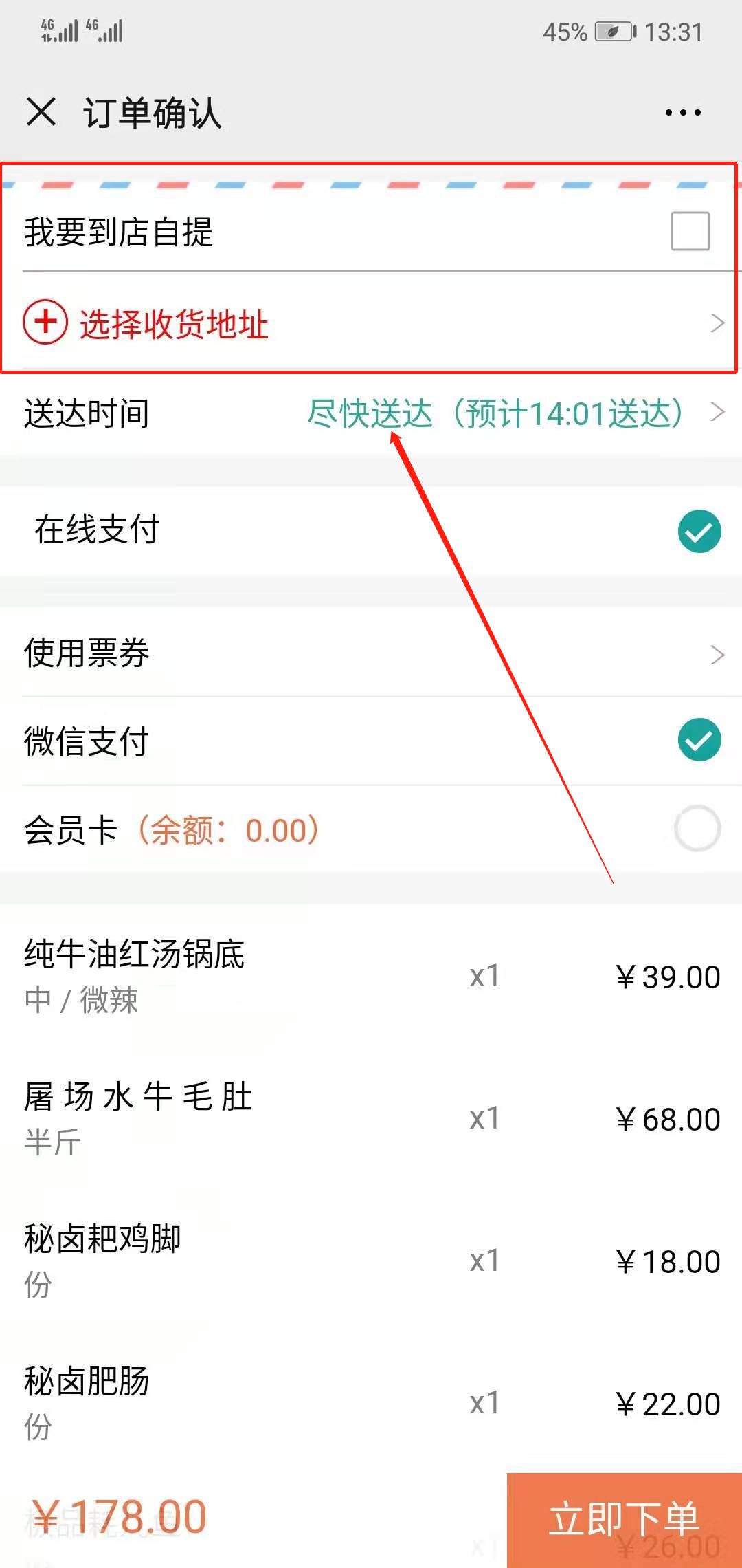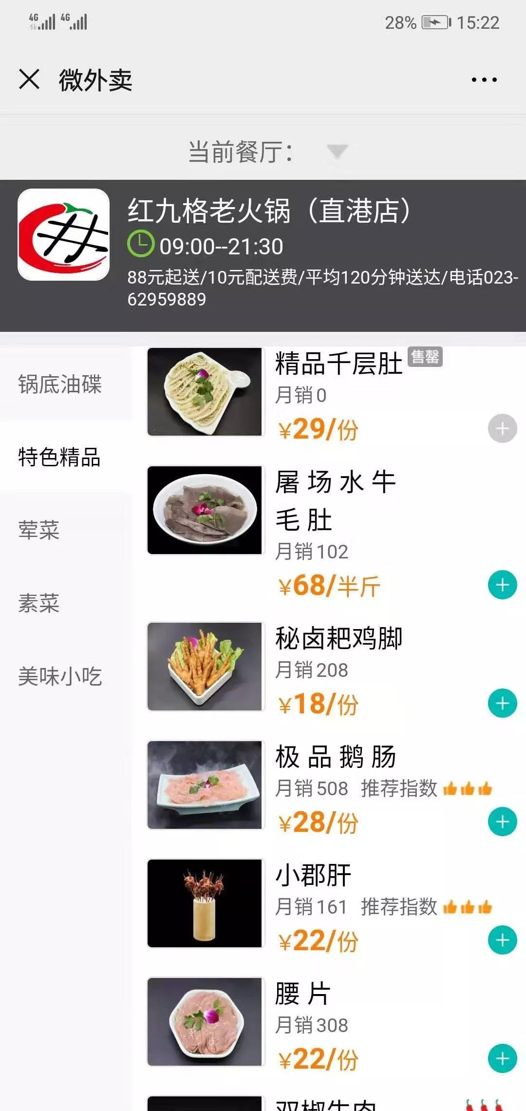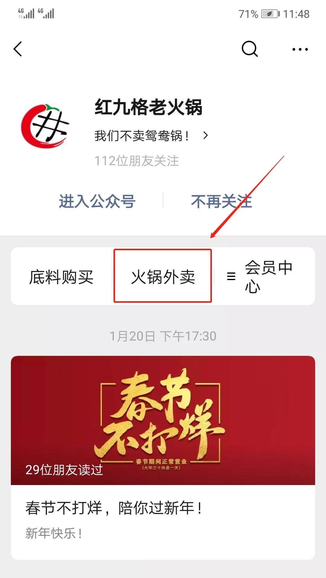 2月1日紅九格就通過排隊網微外賣功能在公眾號上線火鍋外送服務,需要用餐的顧客進入公眾號菜單欄點擊“火鍋外賣”,就能夠選擇門店挑選下單。