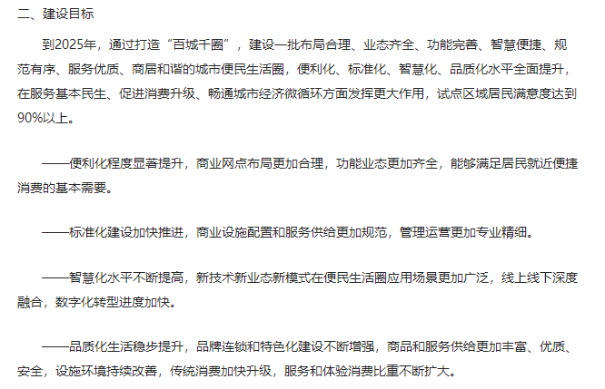 近日,商務部辦公廳等印發《城市一刻鐘便民生活圈建設指南》,提出“到2025年,通過打造‘百城千圈’,建設一批布局合理、業態齊全、功能完善、智慧便捷、規范有序、服務優質、商居和諧的城市便民生活圈,便利化、標準化、智慧化、品質化水平全面提升”。