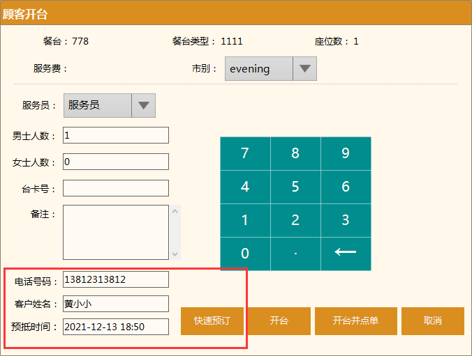 4.酒樓模式新增“開臺快速預訂”功能
