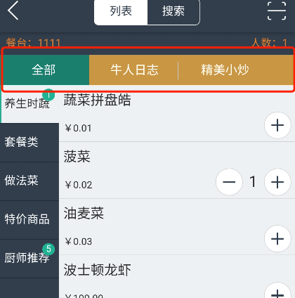 3.酒樓模式新增“菜品大類”顯示功能