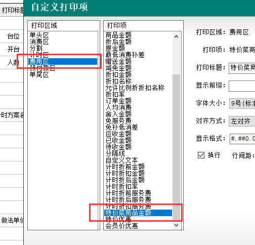 12.預結/結賬小票-費用區,增加“特價菜商品金額”打印項