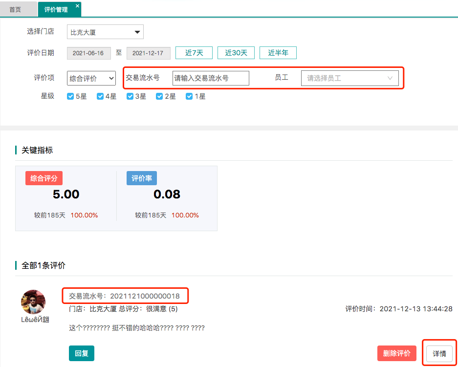 3.【評價管理】評價信息增加顯示“交易流水號”/“員工詳情”以及“交易流水號”/“員工”過濾查詢