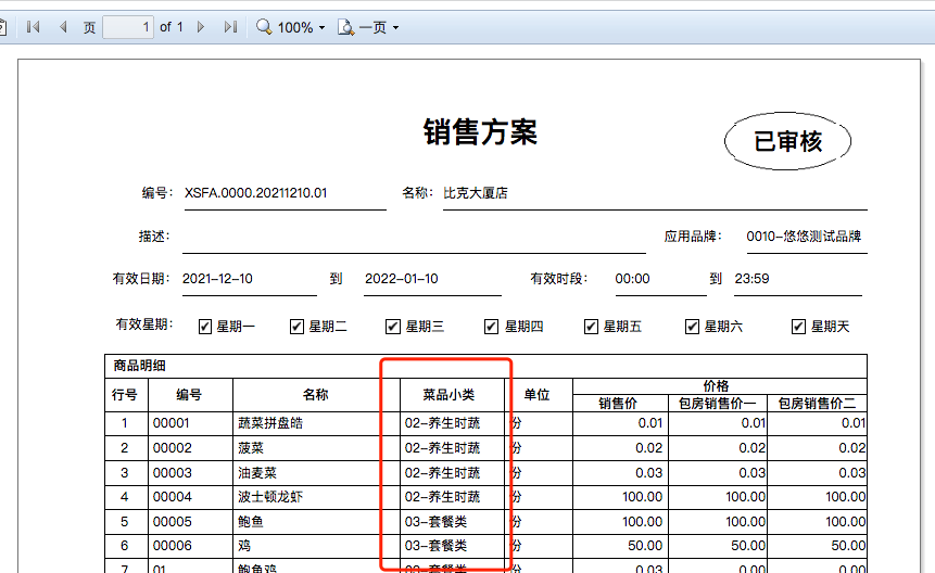 5.【銷售方案】-預覽,菜品類型替換成“菜品小類”