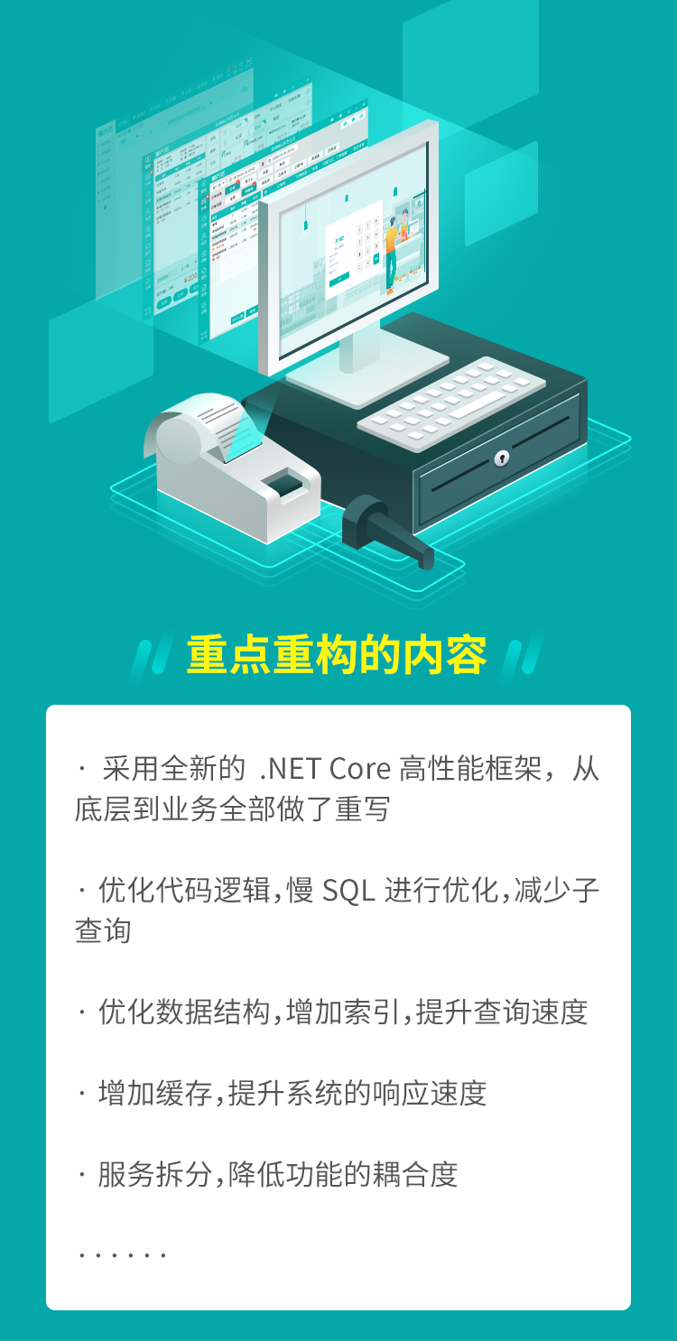 為了滿足業務量爆炸性增長,保證系統的高穩定、高性能、可拓展性,以及對未來AI、大數據大規模應用的前瞻性考量,開發團隊耗費5個月時間,投入80%骨干,基于10年的SaaS系統的開發經驗,對原有系統從底層進行了全新的優化升級。