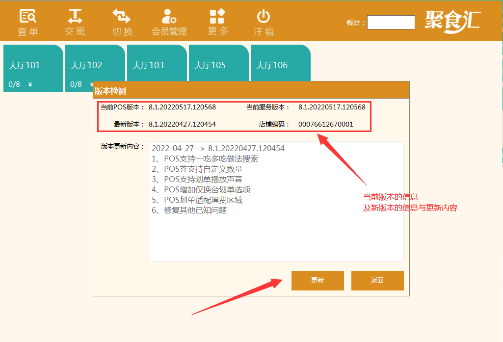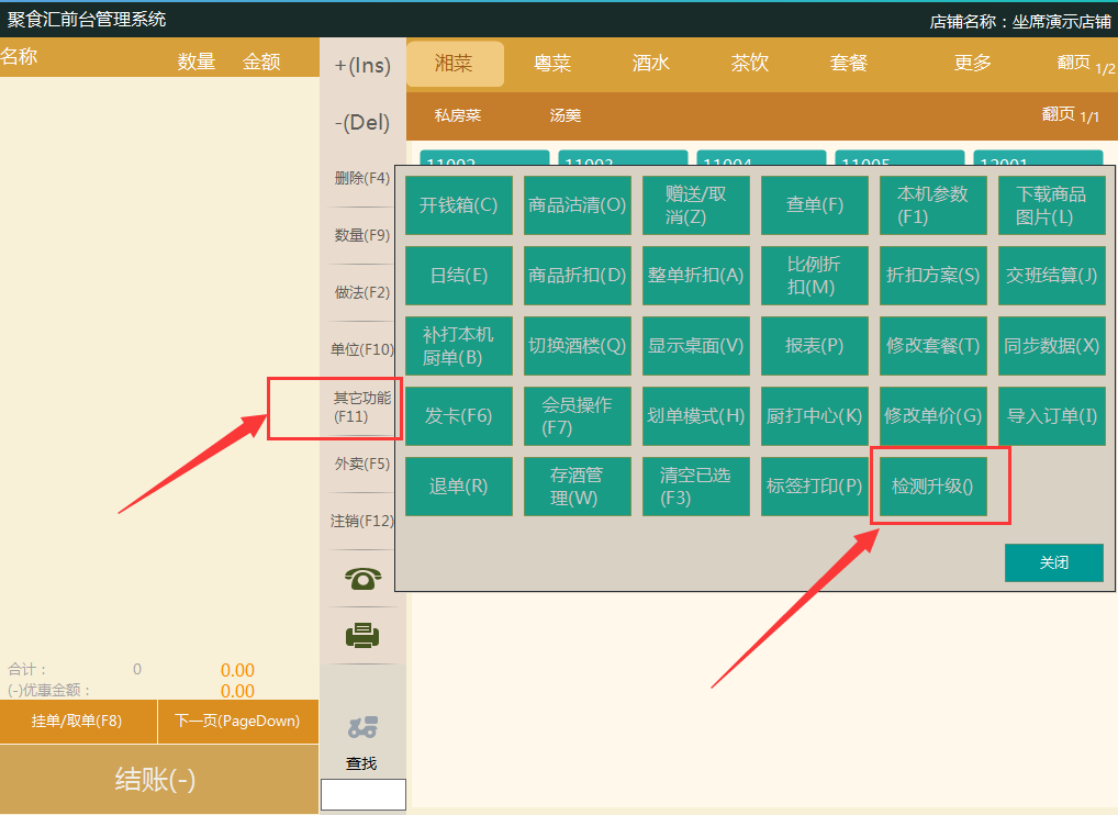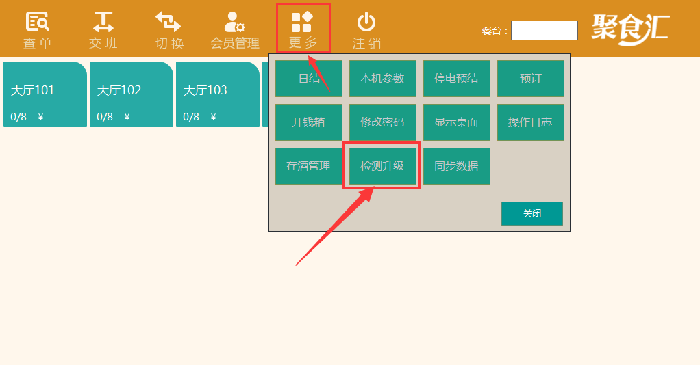 登錄前臺-切換到酒樓模式下-更多-檢測升級