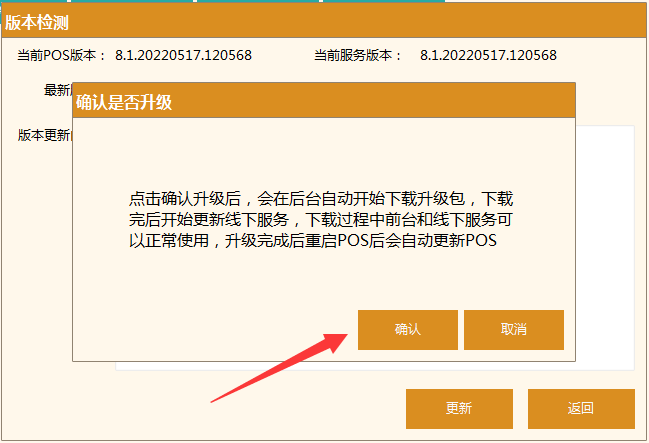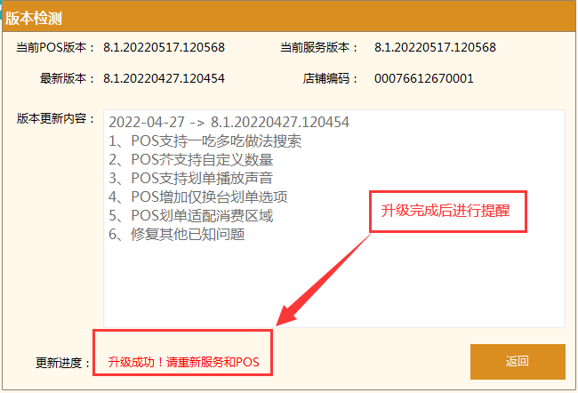參考第一步,在”檢測升級“ 中查詢當前POS版本與最新版本的版本號是否相同,相同則升級成功。