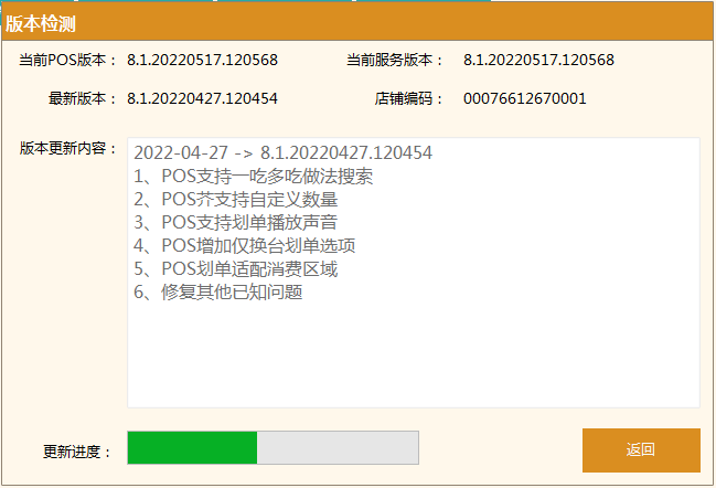 ②檢測更新升級成功后不退出前臺和重啟服務,不影響繼續營業,但是建議錯開營業高峰期再升級。下載升級時間根據門店網絡決定,進度條會展示下載及更新的進度。