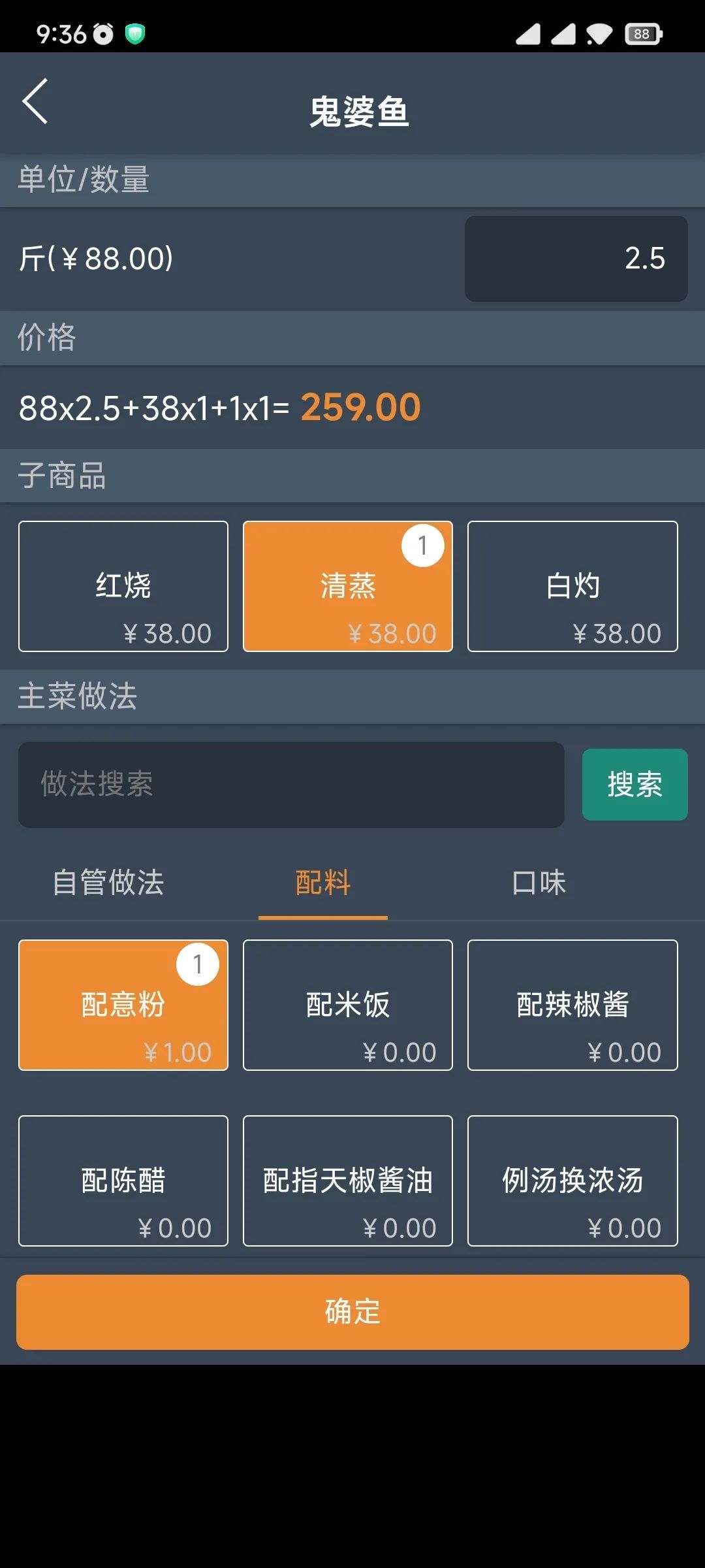 適用場景:在海鮮酒樓,顧客點了一條魚,先稱重算好本身的價格,再選擇具體做法,魚頭用來燉湯、魚身用來煮粥,每一樣再額外計算加工費用。