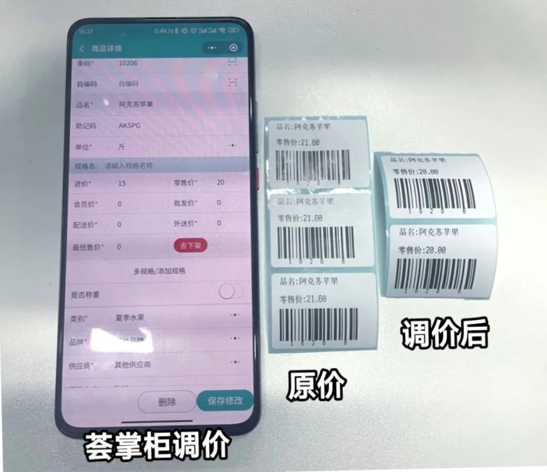 太簡單啦!可以直接使用薈掌柜掃描這個包裝上面的條形碼,快速改價,再次打印標簽就可以啦!