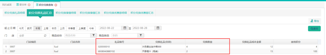 積分兌換禮品匯總報表增加禮品編號、禮品名稱、兌換數量字段