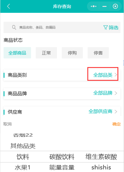 在薈掌柜小程序上面進行庫存查詢,支持到三級小類進行篩選查詢